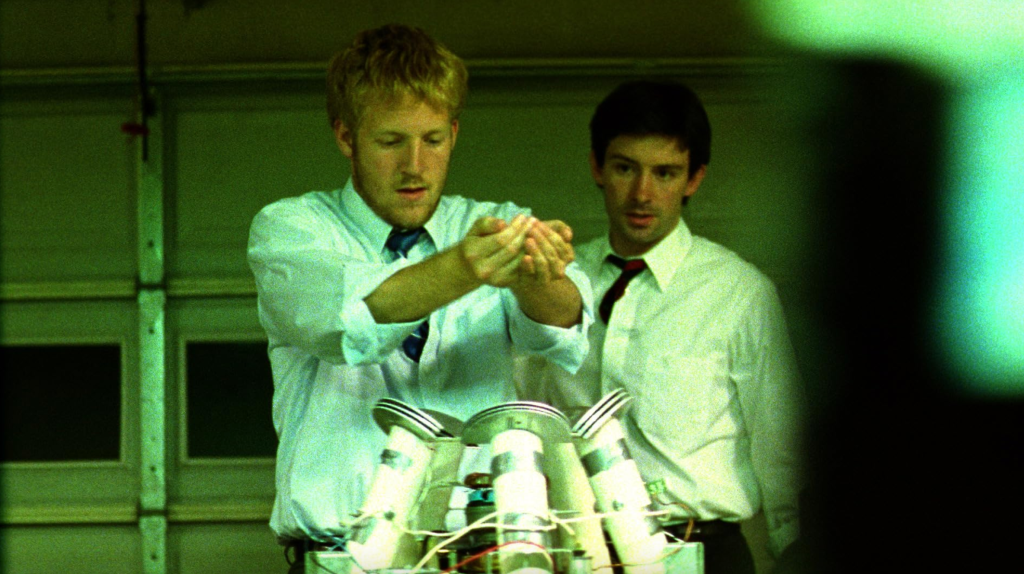 From the rather simple hook “two technophile friends build a box with which they can travel into the past” a complex thriller develops. After 30 minutes, the further course of the plot is no longer predictable, as several turning points mark the second half of the film.