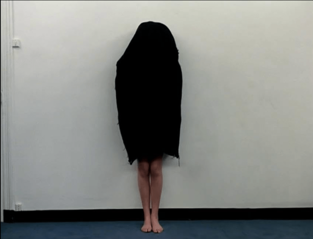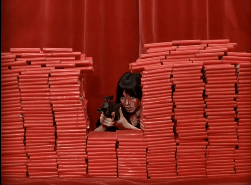 Cut. A woman in a conical hat surrounded by a stack of red books; to be precise, the book “Words of Chairman Mao Tse-Tung” wrapped in red ribbon, multiple, one above the other, side by side. The book as the new masonry brick. And locked inside, a bloodied young woman wearing a traditional Vietnamese cone hat. She calls out to us. She calls out, “The Viet Cong will win.” Once. Twice. Then she is handed a rifle. A toy rifle. She unfolds it and shoots through the stack of books at the invisible enemy behind the camera. At the enemy behind the camera. She folds up the rifle. Folded up, it’s a radio. She follows the horror news announced from the radio. Cut.