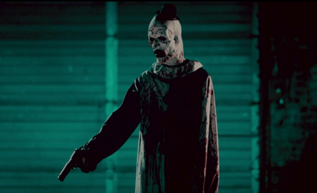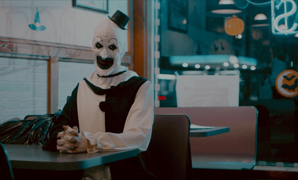 Art the Clown embodies the art of being a clown like no other. In a five-minute scene at the beginning of the film (which unfortunately receives far too little attention), his monstrous strangeness and thus the monstrous strangeness of clowns themselves is staged in the most uncomfortable way possible: He strides into a pizza store, his heavy garbage bag slung over his shoulder. His gaze is fixed on the main character, Tara, as if he could look directly through her eyes into her body of flesh. He sits down at the table next to her and continues his creepy stare, ignoring everyone around him as if they were just smoke and mirrors, until he finally loosens his predatory fixation and beams up to both ears. But his clownish, joyful smile remains fixed on Tara like an awkward man who doesn’t know how to approach the object of his desire. Tara, however, is at the mercy of his intrusive gaze, because while he is masked, she is unmasked. Compared to him as a clown, every emotion can be read from her facial expressions and gestures. She feels completely naked in his superior presence, flayed to the flesh, her vulnerability already torn from her throat and exposed. When he slips a ring from the gumball machine over her finger, her fate is determined. She is at his mercy until death do them part. This demonic creature will not allow a divorce. Because he appears threatening throughout this scene, although he does not directly threaten anyone, but – on the contrary – rather suggests attention and joy and even love, it becomes clear to us that this will not have a good ending (or a good slasher ending).